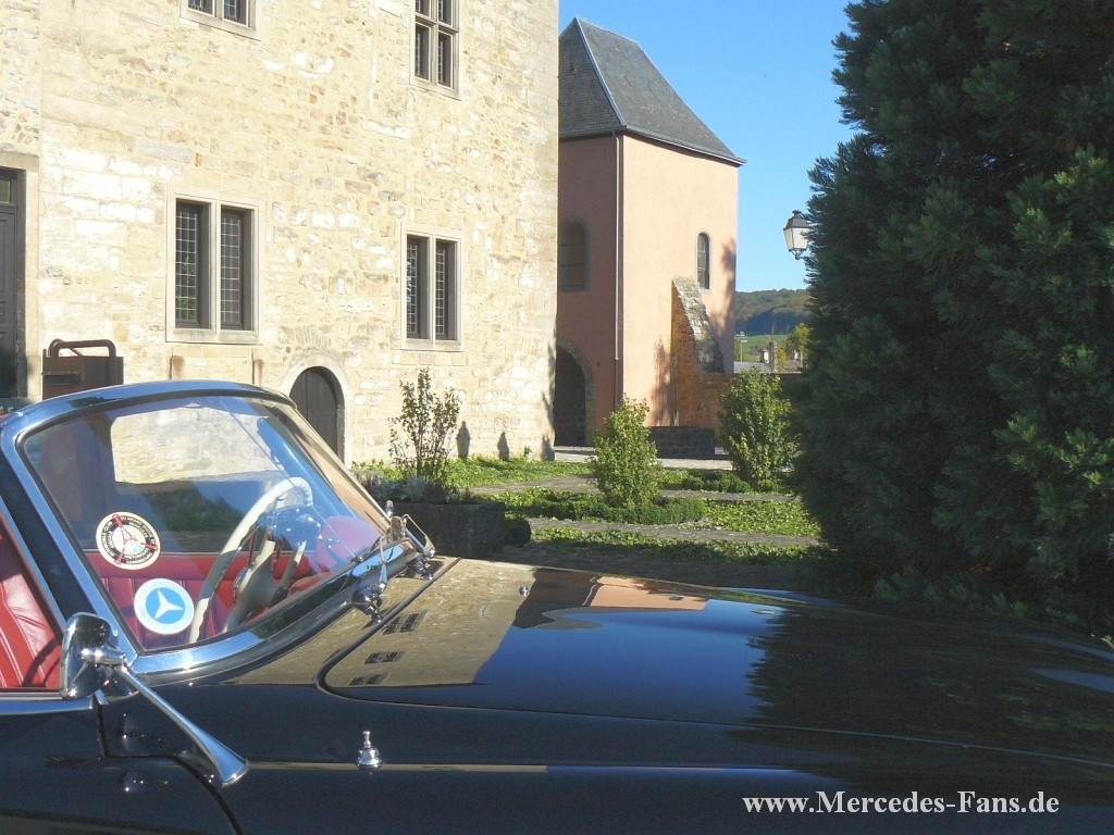 Schwarzer 190 SL mit roter Lederpolsterung, Erinnerungen werden wach an Frankfurter Hochkarat–Milieu in den Fünfziger Jahren des letzten Jahrhunderts. Das Auto einer gewissen Dame, das Zeitgeschichte machte… Ein makellos strahlendes Exemplar dieser Gattung an einem ebenso strahlenden Herbsttag auf malerischen Straßen rund um Luxemburg zu erleben, ist sicherlich eine Alternative zur damaligen Szene in Frankfurt, zumal es um einen Filmstar geht. Doch alles in der richtigen Reihenfolge...