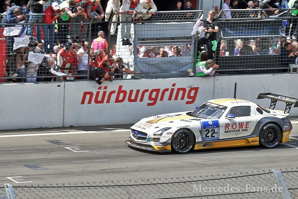 175 Autos traten in der Eifel zum 24 Stunden Rennen an, entschieden wurde der Langstreckenklassiker dann aber zwischen zwei direkten Nachbarn aus Meuspath, einem Dorf in Rufweite zur Döttinger Höhe. Christopher Haase / Christian Mamerow / Rene Rast / Markus Winkelhock im Audi R8 LMS ultra (#4) des Phoenix Racing Teams gewannen vor dem Mercedes-Benz SLS AMG GT3 (#1) des Vorjahressiegers Black Falcon, pilotiert von Jeroen Bleekemolen / Andreas Simonsen / Christian Menzel / Lance David Arnold.