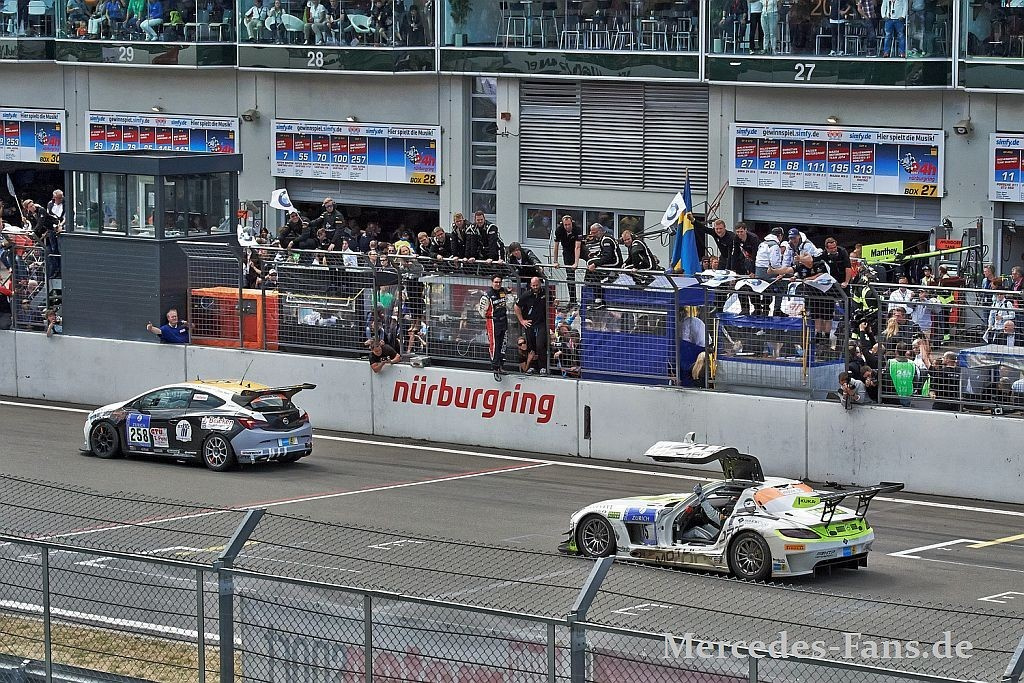 175 Autos traten in der Eifel zum 24 Stunden Rennen an, entschieden wurde der Langstreckenklassiker dann aber zwischen zwei direkten Nachbarn aus Meuspath, einem Dorf in Rufweite zur Döttinger Höhe. Christopher Haase / Christian Mamerow / Rene Rast / Markus Winkelhock im Audi R8 LMS ultra (#4) des Phoenix Racing Teams gewannen vor dem Mercedes-Benz SLS AMG GT3 (#1) des Vorjahressiegers Black Falcon, pilotiert von Jeroen Bleekemolen / Andreas Simonsen / Christian Menzel / Lance David Arnold.