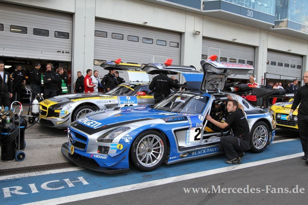 Die Nürburgring-Klischees sind bekannt, aber sie passen einfach! Nirgendwo sind Rennausgang und Wetter unkalkulierbarer als hier, nirgendwo ein Sieg härter aber vielleicht auch glücklicher. Was die Leistung des siegreichen Manthey-Porsche nicht schmälern soll, ganz im Gegenteil. Das Team konnte in den letzten sechs Jahren fünfmal am Ring gewinnen. Der SLS AMG-Armada, angetreten mit guten Chancen auf den Sieg, blieb letztlich nur ein Achtungsergebnis. Zwei der acht gestarteten Flügeltürer kamen unter die ersten Zehn! Und doch, stand am Schluß ein Mercedes-Team auf dem Treppchen ganz oben!