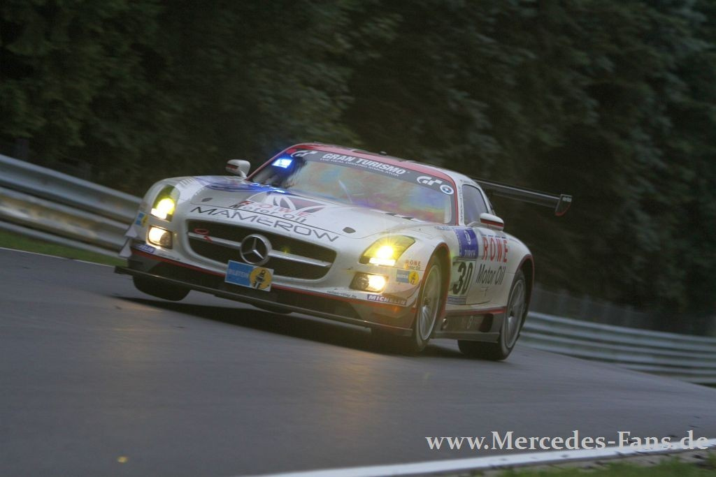 Die Nürburgring-Klischees sind bekannt, aber sie passen einfach! Nirgendwo sind Rennausgang und Wetter unkalkulierbarer als hier, nirgendwo ein Sieg härter aber vielleicht auch glücklicher. Was die Leistung des siegreichen Manthey-Porsche nicht schmälern soll, ganz im Gegenteil. Das Team konnte in den letzten sechs Jahren fünfmal am Ring gewinnen. Der SLS AMG-Armada, angetreten mit guten Chancen auf den Sieg, blieb letztlich nur ein Achtungsergebnis. Zwei der acht gestarteten Flügeltürer kamen unter die ersten Zehn! Und doch, stand am Schluß ein Mercedes-Team auf dem Treppchen ganz oben!