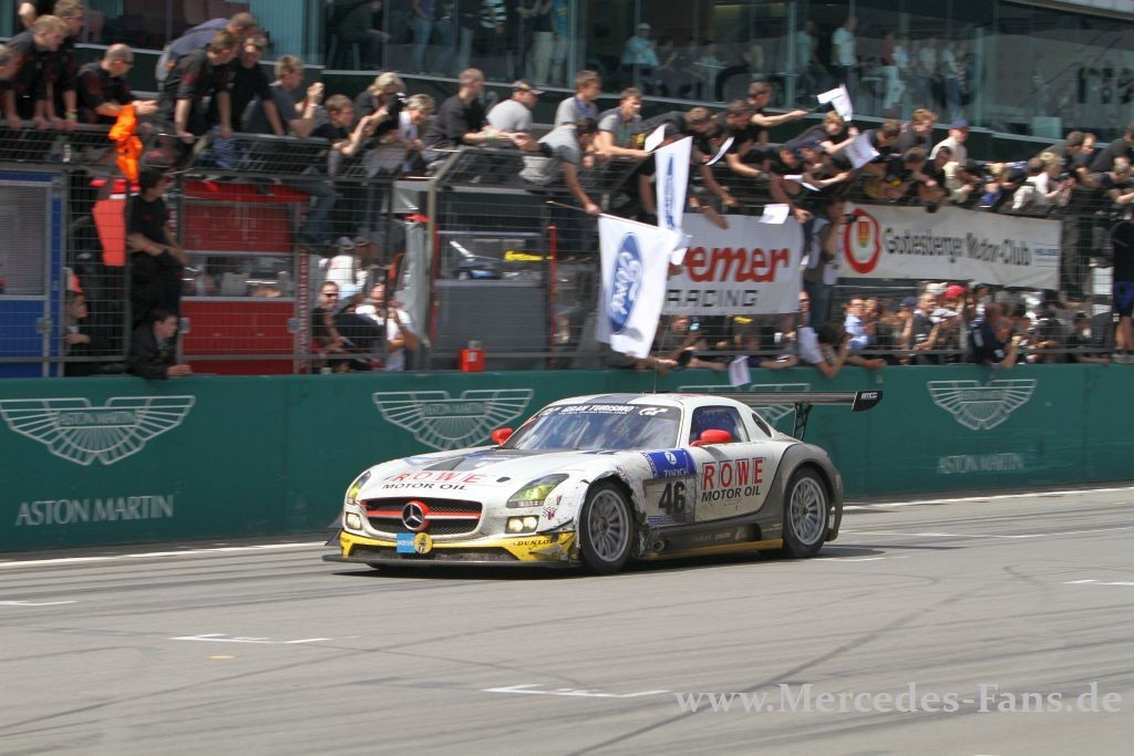 Die Nürburgring-Klischees sind bekannt, aber sie passen einfach! Nirgendwo sind Rennausgang und Wetter unkalkulierbarer als hier, nirgendwo ein Sieg härter aber vielleicht auch glücklicher. Was die Leistung des siegreichen Manthey-Porsche nicht schmälern soll, ganz im Gegenteil. Das Team konnte in den letzten sechs Jahren fünfmal am Ring gewinnen. Der SLS AMG-Armada, angetreten mit guten Chancen auf den Sieg, blieb letztlich nur ein Achtungsergebnis. Zwei der acht gestarteten Flügeltürer kamen unter die ersten Zehn! Und doch, stand am Schluß ein Mercedes-Team auf dem Treppchen ganz oben!