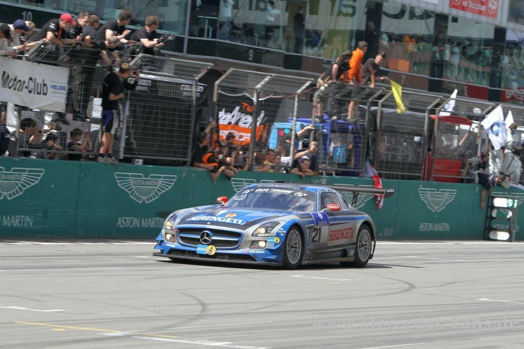 Die Nürburgring-Klischees sind bekannt, aber sie passen einfach! Nirgendwo sind Rennausgang und Wetter unkalkulierbarer als hier, nirgendwo ein Sieg härter aber vielleicht auch glücklicher. Was die Leistung des siegreichen Manthey-Porsche nicht schmälern soll, ganz im Gegenteil. Das Team konnte in den letzten sechs Jahren fünfmal am Ring gewinnen. Der SLS AMG-Armada, angetreten mit guten Chancen auf den Sieg, blieb letztlich nur ein Achtungsergebnis. Zwei der acht gestarteten Flügeltürer kamen unter die ersten Zehn! Und doch, stand am Schluß ein Mercedes-Team auf dem Treppchen ganz oben!