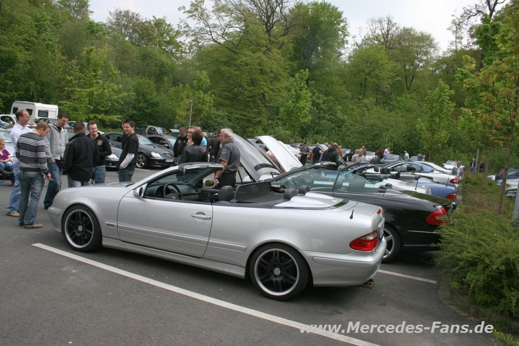 Haltern am See hat CLK gewählt! Am Tag der NRW-Landtagswahl stand bereits bei den ersten Hochrechnungen fest – die Wahl ist für den Mercedes-Zweitürer erfolgreich ausgegangen! Sage und schreibe 58 Coupés und Cabriolets der Baureihen W208 und W209 haben sich auf dem großen Parkplatz am idyllisch im Wald und an der Mündung des Flüsschens Stever gelegenen „Lakeside Inn“ getroffen. Die absolute Mehrheit hatten dabei die CLK der ersten Baureihe, kein Wunder waren die 209er zum ersten Mal dabei, schafften aber auf Anhieb die Fünf-Prozent-Hürde! Die vielen verschiedenen Kennzeichen verrieten, dass die Fahrer und Fahrerinnen zum Teil eine längere Anreise hatten. Ab Nachmittags hatte sich ein Teil der Gemeinde dann ins Innere des atmosphärischen Restaurants verlagert, um die kulinarischen Genüsse der amerikanisch-inspirierten Küche zu kosten. Ein anderer Teil kam dem Pflichtbesuch am Muttertag nach. Alles in Allem kann das 5. CLK Treffen in Haltern am See als Erfolg gewertet werden, wann sieht man schließlich mal 58 CLKs auf einem Parkplatz…