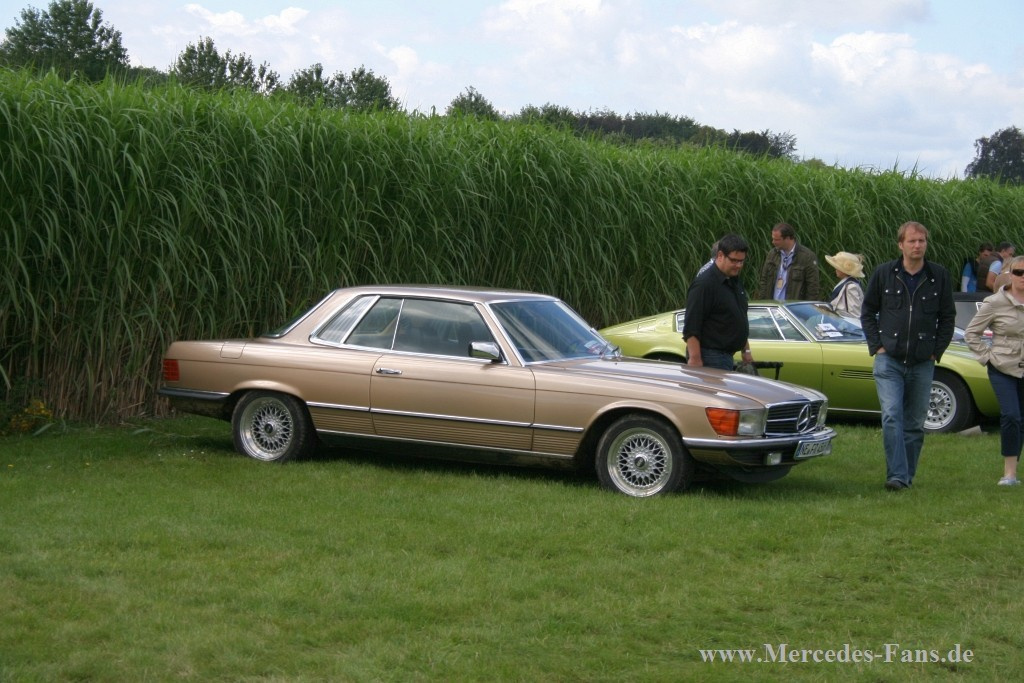 Auf dem vorgelagerten Miscanthusfeld fanden sich nicht nur vereinzelte Sternfahrer sondern auf einer großen Rasenfläche ein eigener Mercedes-Club Bereich, der von Pagode über SL R107 und W123 bis hin zum S-Klasse Club reichte. Der Mercedes-Fan hatte somit einiges zum Gucken und Fotografieren. Leider reihten sich auch einige Neufahrzeuge unter die Oldtimer und störten das Bild des Klassiker-Events.