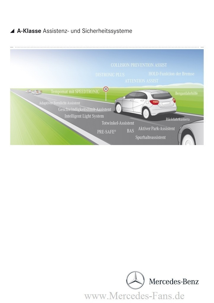 Alles auf Angriff: Mit der neuen A-Klasse geht Mercedes mutig und offensiv in eine neue Richtung. So kompakt, so sportlich, so volksnah präsentierten sich die Stuttgarter noch nie. Die A-Klasse soll für den Pulsschlag einer neuen Generation stehen. Der Erfinder des Automobils schlägt mit der neuen A-Klasse ein neues Kapitel im Kompaktsegment auf: ausgesprochen emotional im Design, dynamisch mit Motoren von 109 PS bis 211 PS, hocheffizient mit Emissionswerten ab 99 g CO2/km. Gleichzeitig unterstreicht sie, dass Sicherheit bei Mercedes-Benz keine Preisfrage ist – unter anderem ist das radargestützte Assistenzsystem COLLISION PREVENTION ASSIST serienmäßig an Bord. Zu den europäischen Händlern rollt die neue Mercedes-Benz A-Klasse im September 2012.