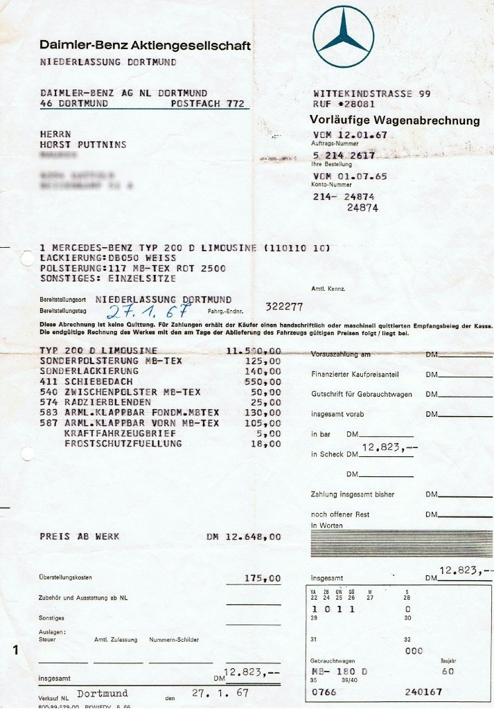 Seit fast 45 Jahren im Alltagseinsatz und das im Erstbesitz! So etwas gibt es nicht etwa nur im sonnigen Kalifornien, sondern mitten im Ruhrgebiet - in Castrop-Rauxel. Ausgeliefert zu einer Zeit, als hier noch kein blauer Himmel herrschte, sondern Kohle und Stahl das Landschaftsbild prägten. Doch der Reihe nach… Es geht um eine 200 D Heckflosse, bestellt am 01.07.1965, ausgeliefert Anfang 1967 - so war das eben damals mit den Lieferzeiten!- von der Mercedes-Benz Niederlassung Dortmund und noch am Erstzulassungstag auf den heutigen Besitzer übergegangen.