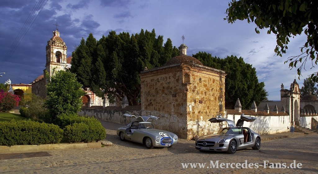 Der Siegerwagen Mercedes-Benz 300 SL aus dem Jahr 1952 und ein aktueller Mercedes-Benz SLS AMG erinnern an einen Mercedes Triumph in Mexico.