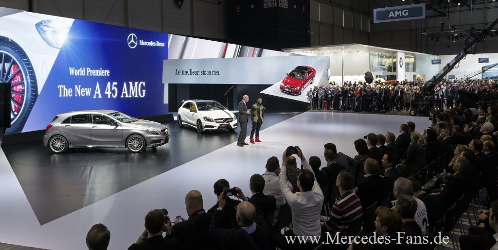 Auf dem 83. Auto Salon in Genf zeigt sich Mercedes-Benz mit seinem breiten Angebot an AMG-Modellen von der starken Seite. Die Weltpremiere des Mercedes A 45 AMG steht zweifellos im Mittelpunkt der Präsens von Mercedes in Genf. Vorgestellt wurden aber auch die neue E-Klasse oder das viertürige Mid-Size Coupé CLA. Mercedes-Fans.de zeigt Ihnen die schönsten Schnappschüsse von der Präsentation von Mercedes-Benz in Genf.