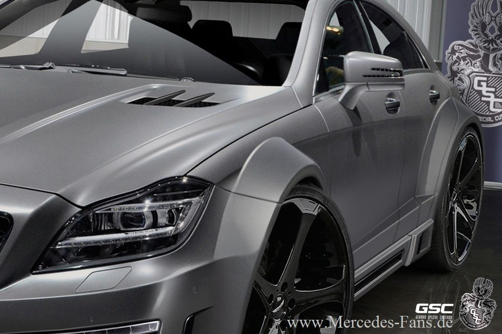 Codename "Stealth": Der deutsche Tuner GSC (German Special Customs) hat für den Mercedes CLS 63 AMG ein fulminantes Performance-Kit entwickelt. "Stealth" nennt sich Breitbau-Kit, welches das viertürige Mercedes AMG Coupé mächtig dastehen lässt. Zum wuchtigen GSC-Widebody-Kit gehören eine Frontstoßstange mit Carbon, Heckstoßstange mit Carbon, Seitenschweller, Kotflügelverbreiterungen, Carbon Kühlergrill, Doppelauspuff, Spoilerlippe und eine Carbon Motorhaube.":