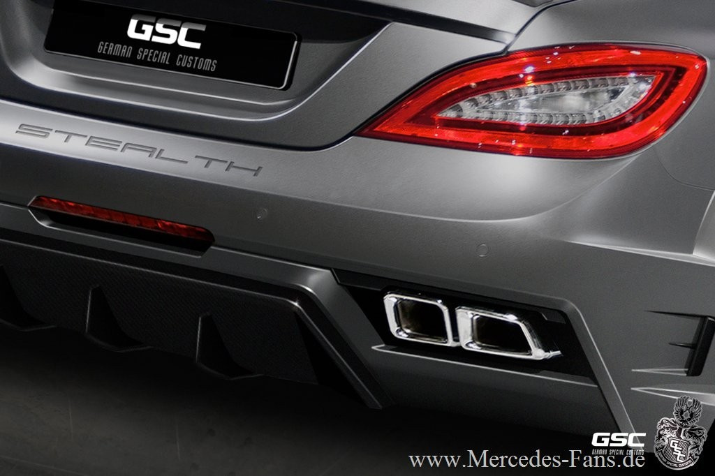Codename "Stealth": Der deutsche Tuner GSC (German Special Customs) hat für den Mercedes CLS 63 AMG ein fulminantes Performance-Kit entwickelt. "Stealth" nennt sich Breitbau-Kit, welches das viertürige Mercedes AMG Coupé mächtig dastehen lässt. Zum wuchtigen GSC-Widebody-Kit gehören eine Frontstoßstange mit Carbon, Heckstoßstange mit Carbon, Seitenschweller, Kotflügelverbreiterungen, Carbon Kühlergrill, Doppelauspuff, Spoilerlippe und eine Carbon Motorhaube.":