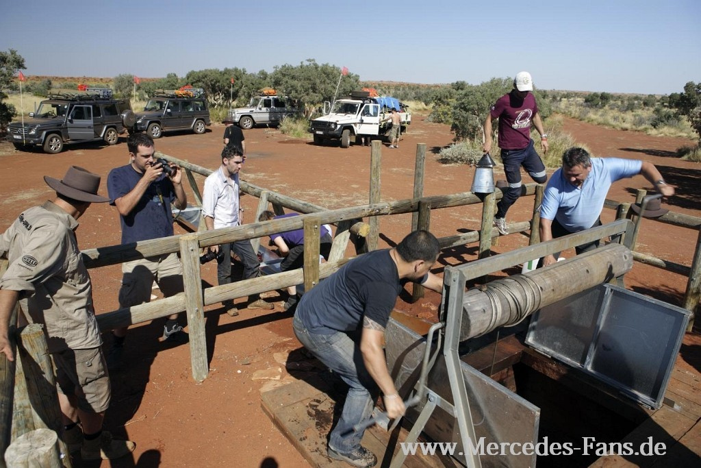 Anlässlich der Einführung des G auf dem australischen Markt und der Auferstehung des G als Rechtslenker war die Idee für die außergewöhnliche PR-Tour bei Daimler entstanden. Das war eine Chance, die ich mir nicht entgehen lassen konnte. Die Canning Stock Route ist in Australien so berühmt-berüchtigt wie in Deutschland der Nürburgring. Die 2.000 km lange Automarter ist eine Aneinanderreihung aus extrem schlechten Wellblechpisten, Felsen, Dünen und Salzseen. Sie folgt einer Viehtriebsroute aus dem 19. Jahrhundert, alle 30-80 km gibt es einen Brunnen (Well), dort sind die Rastplätze für die Traveller. Auf der Hälfte der Strecke liegt Well 33, die einzige Siedlung auf den endlosen 2.000 km roten Staubs.
