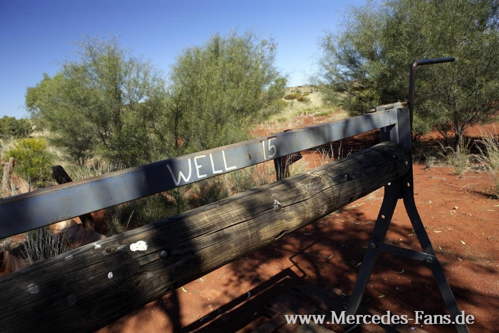 Anlässlich der Einführung des G auf dem australischen Markt und der Auferstehung des G als Rechtslenker war die Idee für die außergewöhnliche PR-Tour bei Daimler entstanden. Das war eine Chance, die ich mir nicht entgehen lassen konnte. Die Canning Stock Route ist in Australien so berühmt-berüchtigt wie in Deutschland der Nürburgring. Die 2.000 km lange Automarter ist eine Aneinanderreihung aus extrem schlechten Wellblechpisten, Felsen, Dünen und Salzseen. Sie folgt einer Viehtriebsroute aus dem 19. Jahrhundert, alle 30-80 km gibt es einen Brunnen (Well), dort sind die Rastplätze für die Traveller. Auf der Hälfte der Strecke liegt Well 33, die einzige Siedlung auf den endlosen 2.000 km roten Staubs.