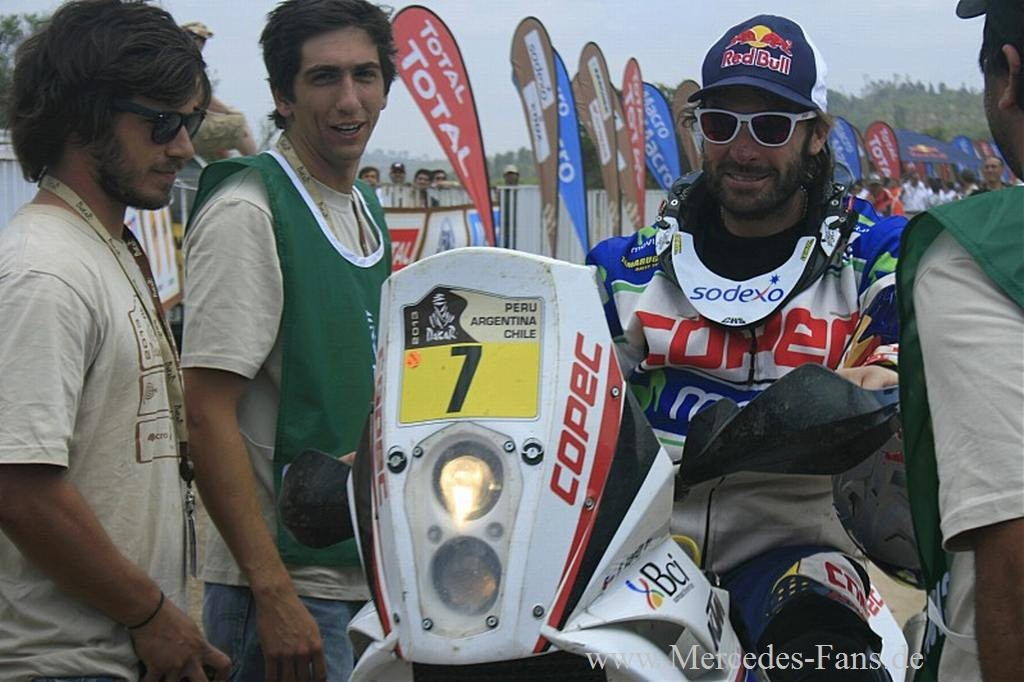 Es wird eine hochklassige Dakar. Zwar gab es - neben einer Verbindung von 250 km - heute nur eine Mini Etappe von 13 Kilometern Sandfahren, aber der Eindruck, den man im Vorfeld gewinnen konnte, hat sich in den Ergebnislisten bestätigt, das Feld ist eng zusammen und die fahrbaren Untersätze von höchster Qualität. Wir verfolgen die Rallye in einem Mercedes G500 - dem wohl komfortabelsten Auto auf der Dakar 2013.