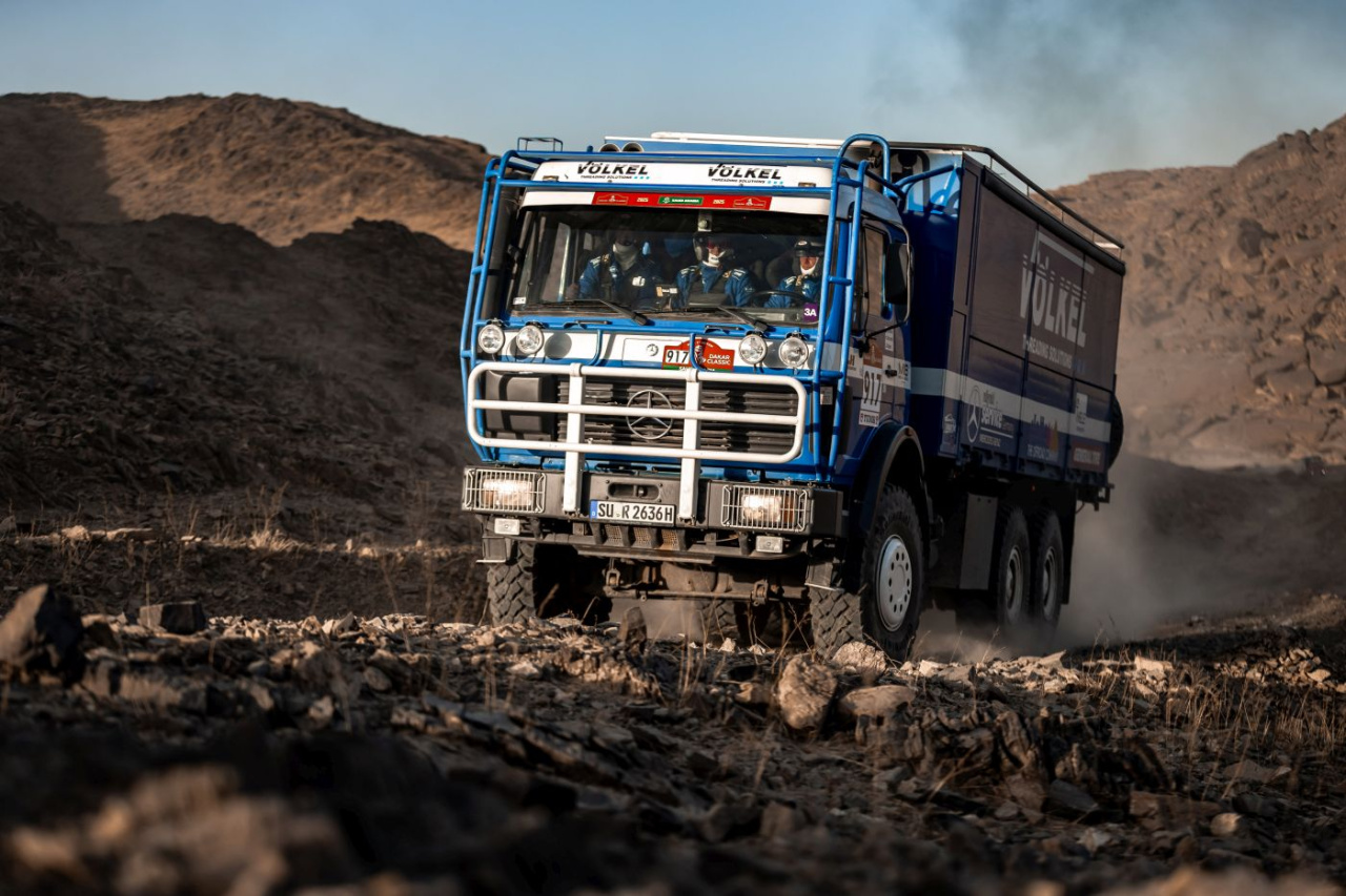 Es ist die härteste Rallye der Welt! Vom 3. Januar an führt die Dakar Rally zwei Wochen über 7500 zu fahrende Gesamtkilometer durch die Wüste Saudi Arabiens. Mit 3 Autos dabei das Völkel Dakar Team, das nach dem großen Erfolg 2024  auch in diesem Jahr wieder in der Kategorie Classic antritt. Die G-Klasse, ein 280 GE, dessen Look und Technik sich am verschollenen G-Modell des Dakar-Siegers 1983 Jackie Ickx und zwei Mercedes-Benz NG 2636 6x6, die als original Service-Trucks des Mitsubishi  Sonauto-Teams bereits ein bewegtes Rallye-Leben hinter sich haben.