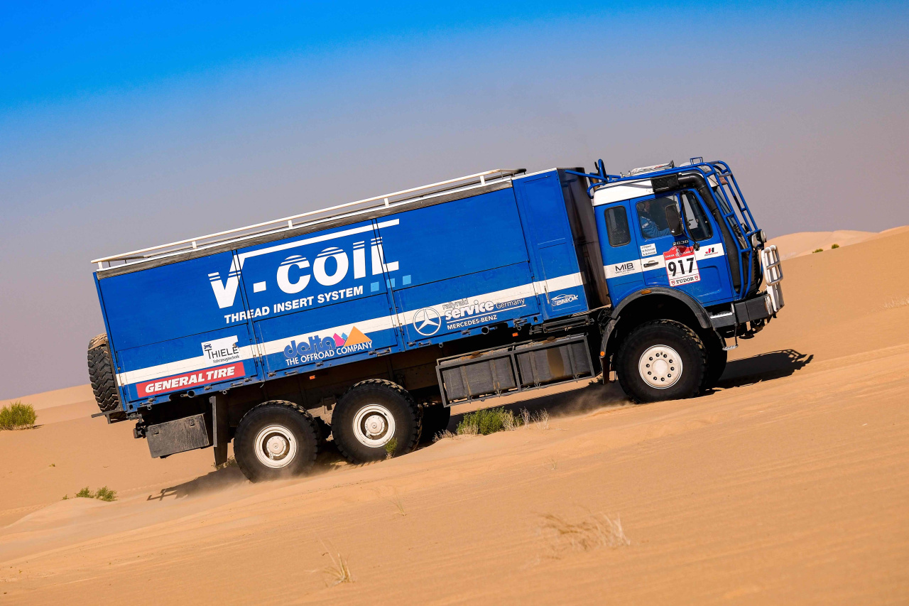 Zwei Mercedes-Benz Lkw-Legenden als rollende Werkstätten beim härtesten Rennen der Welt