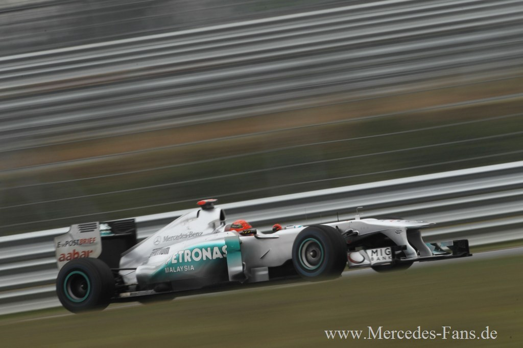 Vom 16. Formel 1 Lauf in Südkorea hat man sich im Mercedes GP Petronas F1 Team nach den guten Qualifying-Leistungen von Altmeister Schumacher wohl mehr erhofft. Doch diese Hoffnungen zerplatzten in der 16. Runde, als Petrow den Rekordweltmeister von der Piste rammte und Schumis Silberfeil zum unfreiwilligen Ausstiegskandidaten machte. Am Ende gewann Sebastian Vettel das Rennen und holte mit seinem Sieg für Red Bull auch die Konstrukteurs-Weltmeisterschaft. Doch auch für Mercedes gab's ein doppeltes Erfolgserlebnis. Erstens fuhr Nico Rosberg mit Rang acht in die Punkte. Und zweitens markiert der zweite Platz von Lewis Hamilton den 100. Podestplatz für Mercedes-V8-Motor in 105 Rennen.