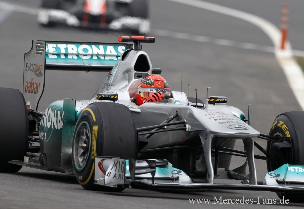 Vom 16. Formel 1 Lauf in Südkorea hat man sich im Mercedes GP Petronas F1 Team nach den guten Qualifying-Leistungen von Altmeister Schumacher wohl mehr erhofft. Doch diese Hoffnungen zerplatzten in der 16. Runde, als Petrow den Rekordweltmeister von der Piste rammte und Schumis Silberfeil zum unfreiwilligen Ausstiegskandidaten machte. Am Ende gewann Sebastian Vettel das Rennen und holte mit seinem Sieg für Red Bull auch die Konstrukteurs-Weltmeisterschaft. Doch auch für Mercedes gab's ein doppeltes Erfolgserlebnis. Erstens fuhr Nico Rosberg mit Rang acht in die Punkte. Und zweitens markiert der zweite Platz von Lewis Hamilton den 100. Podestplatz für Mercedes-V8-Motor in 105 Rennen.