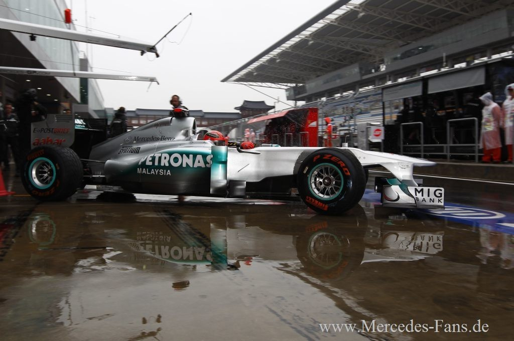 Vom 16. Formel 1 Lauf in Südkorea hat man sich im Mercedes GP Petronas F1 Team nach den guten Qualifying-Leistungen von Altmeister Schumacher wohl mehr erhofft. Doch diese Hoffnungen zerplatzten in der 16. Runde, als Petrow den Rekordweltmeister von der Piste rammte und Schumis Silberfeil zum unfreiwilligen Ausstiegskandidaten machte. Am Ende gewann Sebastian Vettel das Rennen und holte mit seinem Sieg für Red Bull auch die Konstrukteurs-Weltmeisterschaft. Doch auch für Mercedes gab's ein doppeltes Erfolgserlebnis. Erstens fuhr Nico Rosberg mit Rang acht in die Punkte. Und zweitens markiert der zweite Platz von Lewis Hamilton den 100. Podestplatz für Mercedes-V8-Motor in 105 Rennen.