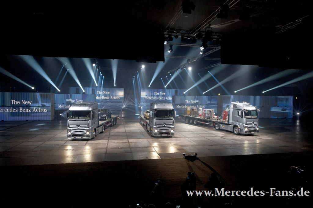 Rock’n Roll! Weder Queen, noch Bruce Springsteen, auch nicht die Foo Fighters oder die Kings of Leon hätten einen beeindruckenderen Auftritt hinlegen können, als das Mega-Trio, das soeben unter dem dröhnenden Bass des Sounds und der bombenstarken Inszenierung der Scheinwerfer-Hundertschaften auf die Bühne rollte! Nach 15 Jahren on the Road stellte Mercedes-Benz dem Fachpublikum einen neuen Actros vor und ich hätte ehrlich gesagt nie gedacht, dass ich mal für einen LKW klatschen würde!