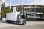 Daimler präsentierte Anfang der Woche den neuen Mercedes-Benz Antos, die erste spezialisierte Fahrzeugbaureihe für den Einsatz im schweren Verteilerverkehr. Die Publikums­premiere wird auf der Nutzfahrzeug IAA im September in Hannover gefeiert. Ob Lebensmittel-, Heizöl-, Baustoff- oder Kommunalverkehr: Der Antos mit 18 t bis 26 t zulässigem Gesamtgewicht ist im Regionalverkehr zu Hause. Besondere Akzente setzt der Antos mit seinem Design, auch wenn sein Äußeres die Verwandtschaft zum neuen Actros unverkennbar erkennen lässt. Entsprechend seinem häufig urbanen Einsatz­gebiet wirkt der Antos einerseits sehr freundlich. Die relativ flache Bauweise für den Verteilerverkehr lässt ihn jedoch gleichzeitig sehr robust und stämmig aussehen.