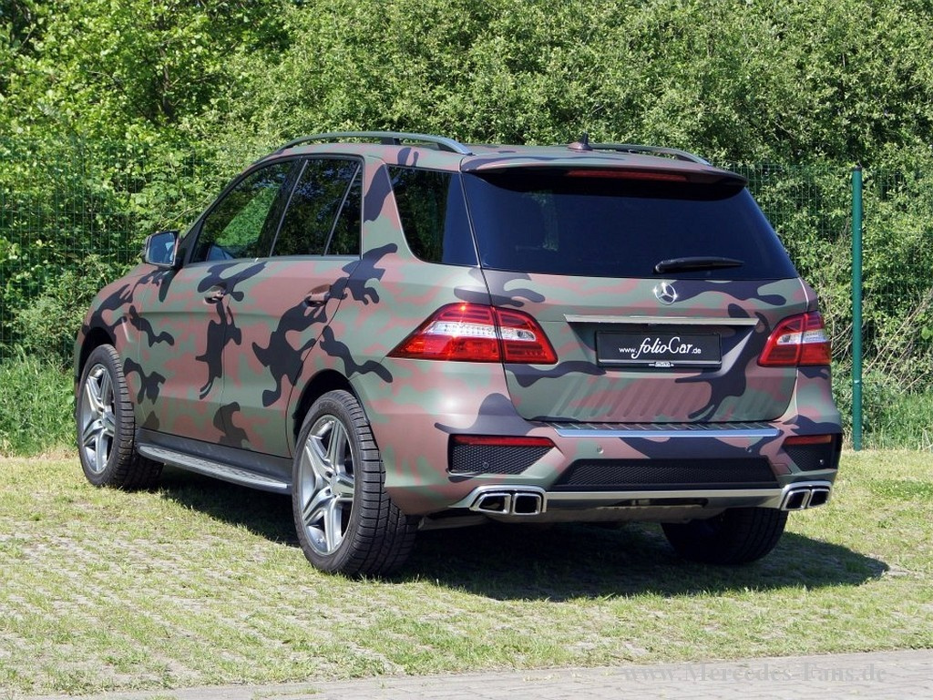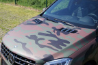 Das macht auch nicht jeder mit 'nem ML 63 AMG, oder? Ein neuer Mercedes-Benz SUV wurde von der Firma FolioCar komplett in eine Folie mit Camouflage-Design eingehüllt. Eigens für diesen Geländewagen wurde dazu eine Folie mit einem hochauflösenden Druck versehen. Eine aufwändige Sache, wenn man bedenkt, dass die Übergänge zwischen den einzelnen Bauteilen wie Stoßstange und Kotflügel zum Beispiel, die einzeln foliert sind, passen müssen.
