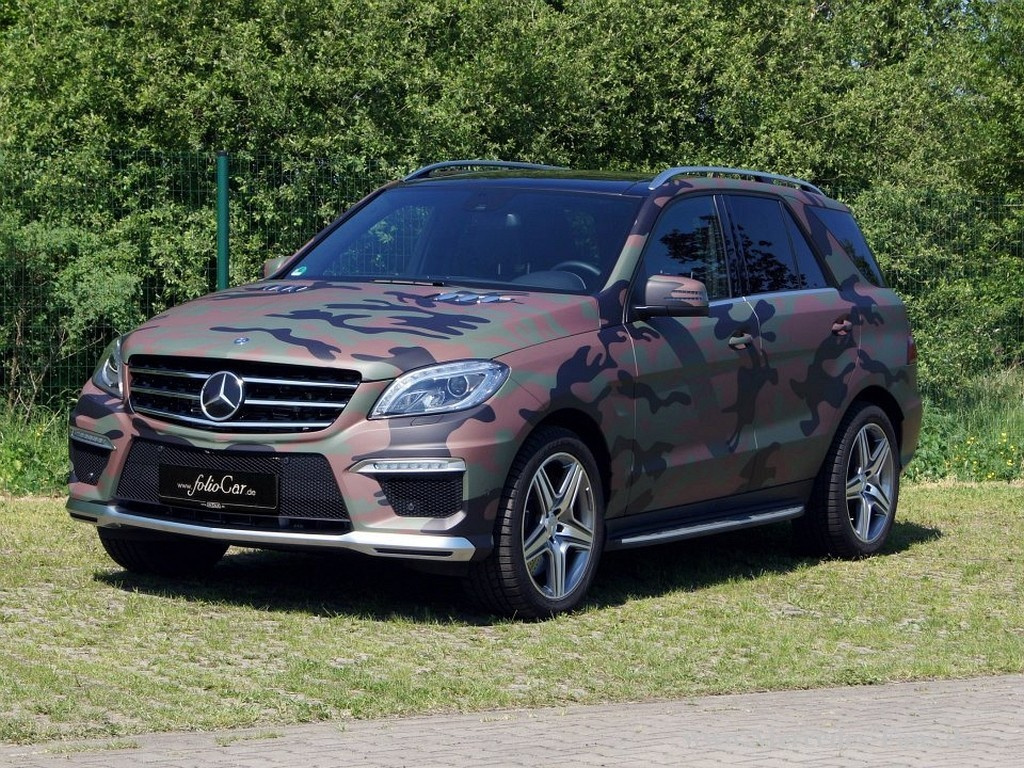 Das macht auch nicht jeder mit 'nem ML 63 AMG, oder? Ein neuer Mercedes-Benz SUV wurde von der Firma FolioCar komplett in eine Folie mit Camouflage-Design eingehüllt. Eigens für diesen Geländewagen wurde dazu eine Folie mit einem hochauflösenden Druck versehen. Eine aufwändige Sache, wenn man bedenkt, dass die Übergänge zwischen den einzelnen Bauteilen wie Stoßstange und Kotflügel zum Beispiel, die einzeln foliert sind, passen müssen.