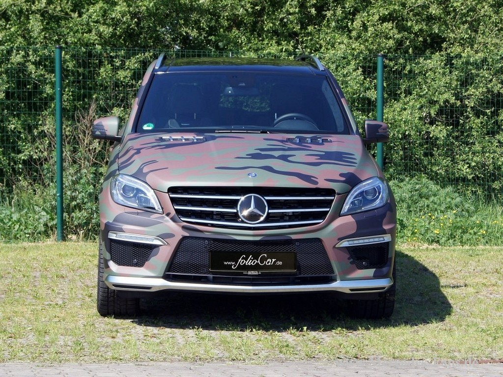 Das macht auch nicht jeder mit 'nem ML 63 AMG, oder? Ein neuer Mercedes-Benz SUV wurde von der Firma FolioCar komplett in eine Folie mit Camouflage-Design eingehüllt. Eigens für diesen Geländewagen wurde dazu eine Folie mit einem hochauflösenden Druck versehen. Eine aufwändige Sache, wenn man bedenkt, dass die Übergänge zwischen den einzelnen Bauteilen wie Stoßstange und Kotflügel zum Beispiel, die einzeln foliert sind, passen müssen.