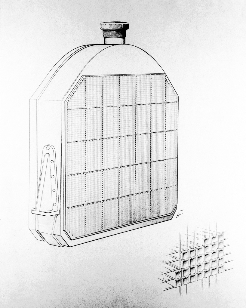 Zeichnung des von Wilhelm Maybach erfundenen Bienenwabenkühlers. Er wird zum ersten Mal im Mercedes 35 PS eingesetzt, dem ersten modernen Automobil, dessen Konzept ebenfalls von Maybach stammt. Der effiziente Kühler erlaubt eine erhebliche Leistungssteigerung des Fahrzeugs. Die abgebildete, oben abgerundete Kühlerform entspricht der ab 1903 verwendeten Ausführung.