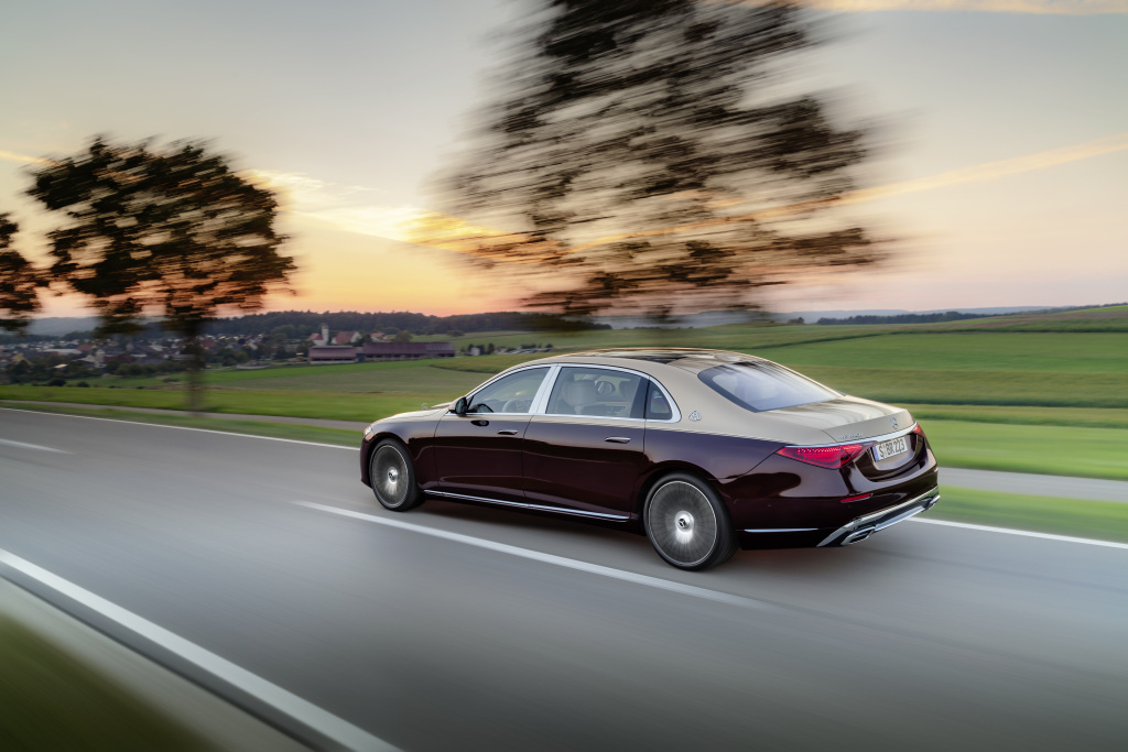 Die neue Mercedes-Maybach S-Klasse der Baureihe 223, Fahraufnahme von links hinten. Foto aus dem Jahr 2020.