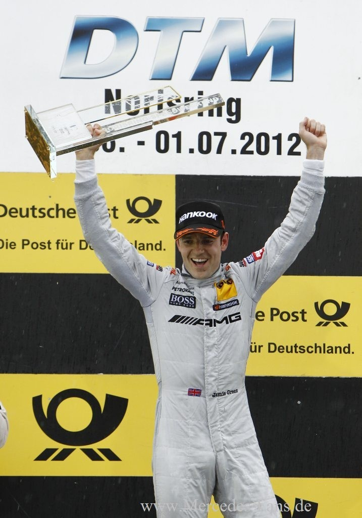 Jamie Green (Mercedes AMG C-Coupé) gewann den fünften Saisonlauf der DTM in Nürnberg mit einem Überholmanöver in der letzten Kurve mit 0,687 Sekunden Vorsprung auf Martin Tomczyk (BMW). Es war Greens achter Sieg in der DTM und der vierte in Nürnberg. Damit hat er die Hälfte seiner Erfolge auf dem Norisring eingefahren (2008, 2009, 2010, 2012). Der Brite stand in seinem 79. DTM-Rennen zum 19. Mal auf dem Podium.