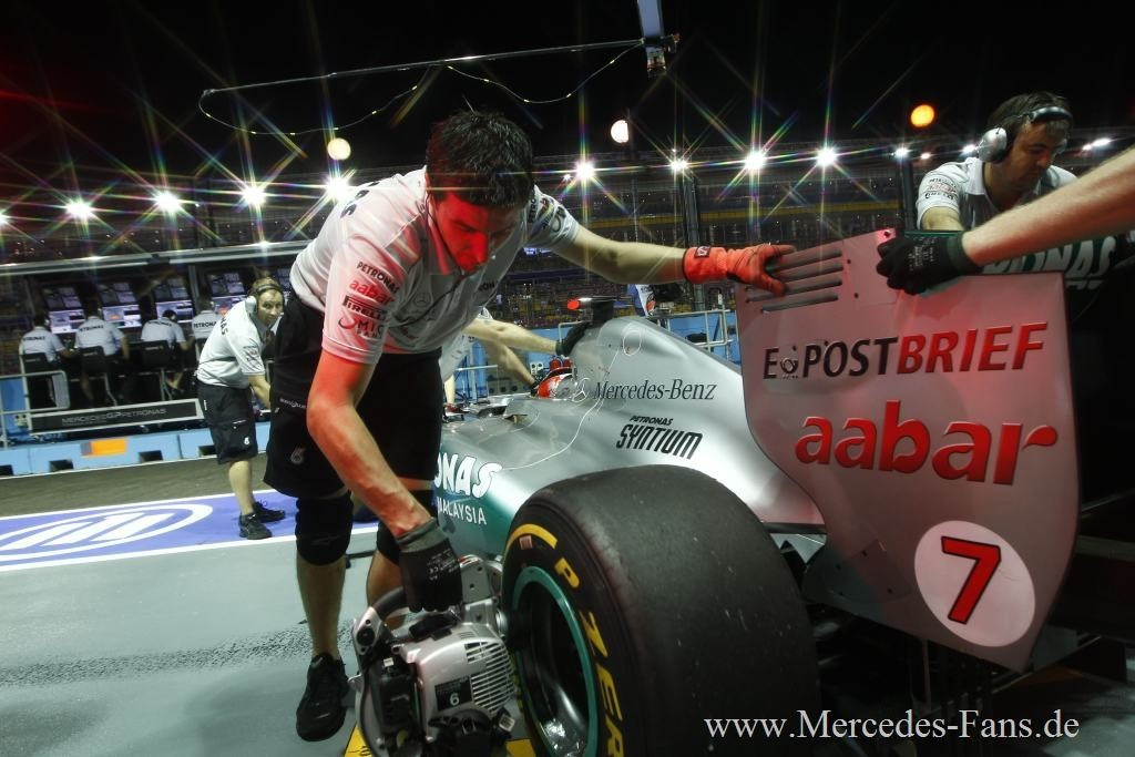 Die Formel 1 Wetmeisterschaft 2011 dürfte nach dem Grand Prix in Singapur vorzeitig entschieden sein. Sebastian Vettel fehlt nach seinem Triumph beim Nachtrennen nur noch ein Pünktchen, um sich zum zweiten mal die Formel 1 Weltmeisterschaft zu holen. Ihm gelingt, was den Mercedes-Piloten derzeit leider nicht glückt. Er siegt. Silberfpeil-Fahrer Nico Rosberg beendete den Großen Preis von Singapur auf Platz sieben. Sein Teamkollege Michael Schumacher fiel nach einer Kollision aus. Michael Schumacher lag auf Position neun, als er in Runde 28 in Kurve acht mit dem Sauber von Sergio Perez zusammenstieß.