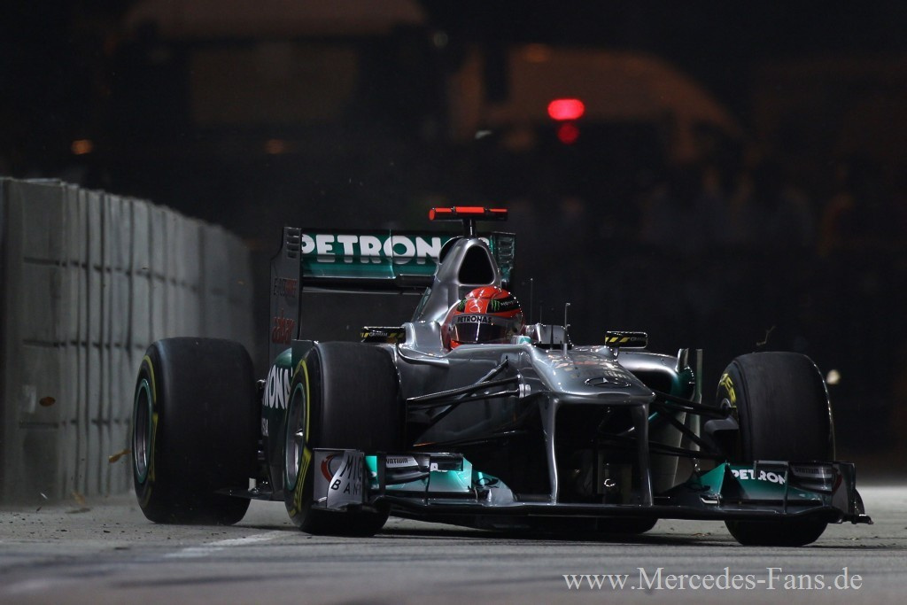 Die Formel 1 Wetmeisterschaft 2011 dürfte nach dem Grand Prix in Singapur vorzeitig entschieden sein. Sebastian Vettel fehlt nach seinem Triumph beim Nachtrennen nur noch ein Pünktchen, um sich zum zweiten mal die Formel 1 Weltmeisterschaft zu holen. Ihm gelingt, was den Mercedes-Piloten derzeit leider nicht glückt. Er siegt. Silberfpeil-Fahrer Nico Rosberg beendete den Großen Preis von Singapur auf Platz sieben. Sein Teamkollege Michael Schumacher fiel nach einer Kollision aus. Michael Schumacher lag auf Position neun, als er in Runde 28 in Kurve acht mit dem Sauber von Sergio Perez zusammenstieß.