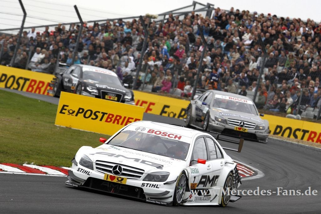 Vor insgesamt 24.000 Besuchern gelang Mercedes-Benz beim "Auswärtsspiel" in Brands Hatch im DTM-Zweikampf gegen Audi der sechste Sieg im siebten Rennen. Der wie entfesselnd fahrende Paul Di Resta ging von der Pole Position ins Rennen, das er nach 98 Runden auch als Erster beendete. Markenkollege Bruno Spengler (Mercedes-Benz Bank AMG C-Klasse) kam als Zweiter ins Ziel. Timo Scheider war auch beim siebten Saisonlauf der DTM in Brands Hatch schnellster Pilot eines Audi A4 DTM
