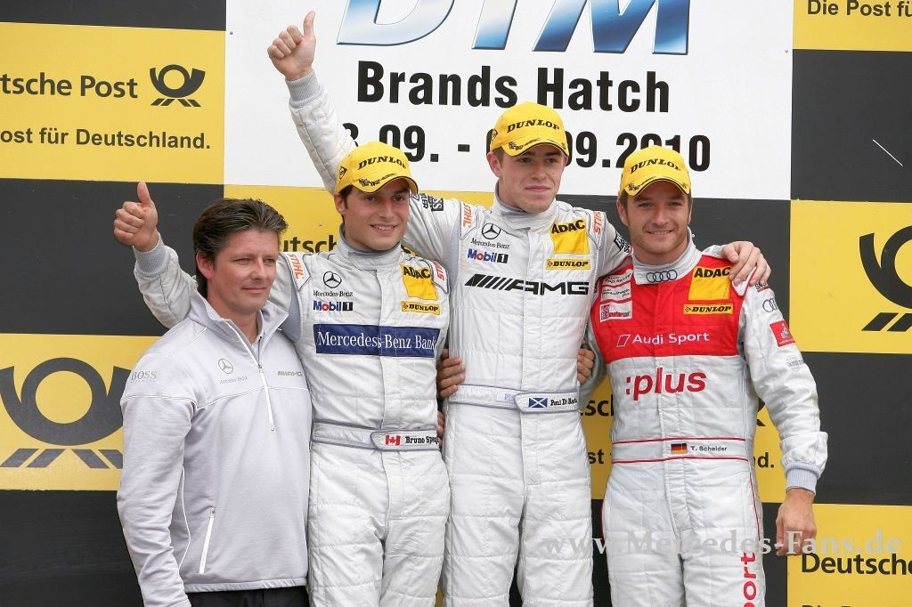 Vor insgesamt 24.000 Besuchern gelang Mercedes-Benz beim "Auswärtsspiel" in Brands Hatch im DTM-Zweikampf gegen Audi der sechste Sieg im siebten Rennen. Der wie entfesselnd fahrende Paul Di Resta ging von der Pole Position ins Rennen, das er nach 98 Runden auch als Erster beendete. Markenkollege Bruno Spengler (Mercedes-Benz Bank AMG C-Klasse) kam als Zweiter ins Ziel. Timo Scheider war auch beim siebten Saisonlauf der DTM in Brands Hatch schnellster Pilot eines Audi A4 DTM