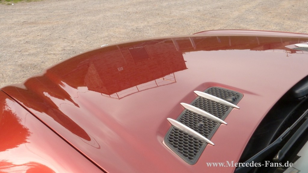 Ein AMG SL 55 in Bernsteinrot Metallic- das geht gar nicht… …so versuchte 2003 der damalige Mercedes-Benz Verkäufer Friedhelm Milas davon abzubringen, seinen Traum - Stern in dieser Farbe statt des AMG – typischen Schwarz oder Silber zu bestellen. Als Friedhelm ganz und gar nicht zu überzeugen war, half nur ein Bonitätsnachweis weiter, denn für das Auto, so der Mercedes-Mann, sei bei Nichtabnahme absolut kein Ersatzkäufer zu finden. Die Sache mit der Bonität scheint funktioniert zu haben, der Rote durfte mit dem Kennzeichen MIL AS 66 (warum nicht …55, hat Friedhelm uns nicht verraten) seine Garage in Zülpich beziehen. Unkonventionell ging´s dann für den roten Renner weiter, er wurde am 14.10.2007 auf dem Hockenheimring zum ersten und bisher einzigen roten Fahrzeug, das je für AMG an einer DTM – Fahrerparade teilgenommen hat. Dass so etwas wohl nur mit einer Sondergenehmigung machbar ist, dürfte selbstverständlich sein. Als Friedhelm 2003 seine rote Rakete kaufte, waren seit der Erstvorstellung im dritten Quartal 2001 knapp zwei Jahre und die ersten Modifikationen des bis dahin leistungs- und drehmomentstärksten Modells des R 230 vergangen. Der neu entwickelte 5,4 l (genau: 5439 ccc) V8-Motor trat zunächst mit 476 PS und einem maximalen Drehmoment von 700 Newtonmeter, die schon bei 2650 U/min. erreicht wurden, vor sein Publikum. Dabei lagen bereits 500 Newtonmeter bei 1500 U/min an. Von 0 auf 100 km/h bescheunigte das Kraftpaket in 4,7 Sekunden. Der zwischen den Zylinderblöcken eingebettete, nach dem Lysholm – Prinzip arbeitende Schraubenkompressor mit einem maximalen Ladedruck von 0,8 bar sorgte für diesen Leistungsschub Ein neu geformter Stoßfänger und Frontspoiler sowie zusätzliche Seitenschweller, 18 Zoll Felgen und eine Vierrohr- Auspuffanlage gaben dem AMG das standesgemäße Äußere. Eine Delikatesse für sich ist allein die vordere Bremsanlage. Mit 360-Millimeter- Scheiben, Achtkolben – Festsätteln und einer Belagfläche von 220 Quadratzentimetern pro Scheibe hat sie die doppelten Dimensionen wie die des parallel angebotenen 500 SL. Spiegel Online schrieb seinerzeit über das Auto: „Leichtes Schwindelgefühl macht sich breit, wenn der Top – Roadster von dem kaum merkbaren Fünfgang – Automatikgetriebe wie von einem Expander gezogen auf die 200 km/h zurast.“ Bei 250 km/h war dann, elektronisch geregelt, Schluss mit diesen Gefühlen. Bis zu Friedhelms Kauf wurde die Motorleistung noch einmal auf 500 PS angehoben und später weiter auf 517 PS gesteigert. Doch zurück zu MIL AS 66: Zunächst, nämlich bis 2006, lief das Auto im Alltagseinsatz mit allem Spaß, den solch ein „Dienstfahrzeug“ bereitet. Danach wurden die Einsätze etwas ruhiger. Inzwischen hat der Wagen 86 800 km auf der Uhr. Veranstaltungen und Fahrerlehrgänge sind die derzeitige Hauptbetätigung. Seit 2010 ist der Rote, natürlich mit Friedhelm und seiner Frau Angelika, regelmäßiger Besucher der Schönen Sterne und ist dort immer (siehe oben: Farbe!) eine der Besonderheiten auf dem Stand der AMG–Freunde Deutschland. Auch deren Jahrestreffen besuchen Friedhelm und Angelika regelmäßig. Dies geschieht in fast „dienstlicher“ Funktion, denn Friedhelm ist Schatzmeister dieser Vereinigung der Freunde schneller Sterne, die seit 2005 besteht und über 100 Mitglieder zählt. Dass das Clubmotto EINER FÜR ALLE; ALLE FÜR EINEN wirklich gelebt wird, war in den letzten Jahre in Hattingen bei den Schönen Sternen immer wieder zu fühlen. Von der Teilnahme an der DTM Fahrerparade 2007 hat sich Friedhelm eine ganz besondere Erinnerung in Form eines Ölgemäldes gegönnt: Von Ante Milas, Theologe und Meisterschüler der Düsseldorfer Kunstakademie (Friedhelm betont: kein Verwandter und ansonsten hauptsächlich mit religiösen Motiven befasst) gemalt, hängt der rote Renner an prominenter Stelle über Friedhelms Schreibtisch. Und dann wurde der Sportler in Rot 2011 auch noch Weltrekordler. Er war bei der Guinness Rekordfahrt auf dem Nürburgring dabei, als am 15.Oktober 219 Mercedes-Benz Fahrzeuge in 24,433 km (15,18 Meilen) langer Formation zum Weltrekord auf dem Nürburgring paradierten. Auch auf pädagogischem Gebiet hat sich Friedhelms Auto inzwischen bewährt. Im Westermann Schulbuch Kuhn Physik SI Ausgabe 2007 Niedersachsen/Gymnasium erscheint der Wagen auf Seite 232 im Kapitel „Arbeit und Leistung“. In Bezug auf Leistung sicherlich ein treffender Repräsentant. Mit seiner geballten Kraft und seinem für einen AMG außergewöhnlichen Auftreten ist er sicherlich auch bei den nächsten Schönen Sternen ein willkommener Gast. Jedenfalls freuen sich Friedhelm und seine Frau Angelika schon auf ein Wiedersehen unter -nicht nur- AMG-Freunden. Technikkasten Baureihe: R 230 Fahrzeugtyp: SL 55 AMG Baujahr: 2003 Motor:  AMG V8, Dreiventil – Kompressor. 5439ccm, 500 PS Getriebe: 5-Gang Automatik mit drucktastengesteuertem manuellem Fahrprogramm Bremsen: Verbundscheibenbremsen, innenbelüftet Räder: 18 “ Alu Vielspeichenfelgen Reifen:  vorn 255/40 R 18 , hinten 285/35 R 18  Fahrwerk: AMG, aktive Fahrwerkregelung, Vorderachse: Doppelquerlenker mit Schraubenfedern, Querstabilisator; Hinterachse: Mehrlenkerachse mit Schraubenfedern, Querstabilisator Karosserie: AMG Innenraum: AMG Serie