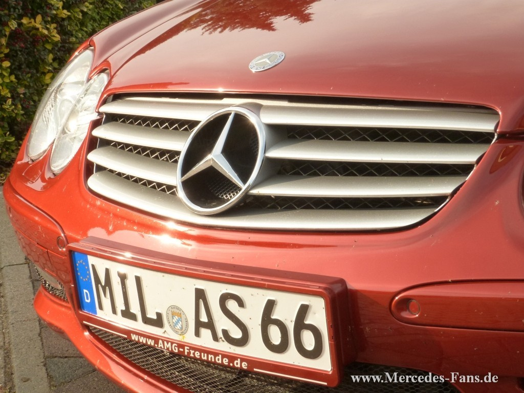 Ein AMG SL 55 in Bernsteinrot Metallic- das geht gar nicht… …so versuchte 2003 der damalige Mercedes-Benz Verkäufer Friedhelm Milas davon abzubringen, seinen Traum - Stern in dieser Farbe statt des AMG – typischen Schwarz oder Silber zu bestellen. Als Friedhelm ganz und gar nicht zu überzeugen war, half nur ein Bonitätsnachweis weiter, denn für das Auto, so der Mercedes-Mann, sei bei Nichtabnahme absolut kein Ersatzkäufer zu finden. Die Sache mit der Bonität scheint funktioniert zu haben, der Rote durfte mit dem Kennzeichen MIL AS 66 (warum nicht …55, hat Friedhelm uns nicht verraten) seine Garage in Zülpich beziehen. Unkonventionell ging´s dann für den roten Renner weiter, er wurde am 14.10.2007 auf dem Hockenheimring zum ersten und bisher einzigen roten Fahrzeug, das je für AMG an einer DTM – Fahrerparade teilgenommen hat. Dass so etwas wohl nur mit einer Sondergenehmigung machbar ist, dürfte selbstverständlich sein. Als Friedhelm 2003 seine rote Rakete kaufte, waren seit der Erstvorstellung im dritten Quartal 2001 knapp zwei Jahre und die ersten Modifikationen des bis dahin leistungs- und drehmomentstärksten Modells des R 230 vergangen. Der neu entwickelte 5,4 l (genau: 5439 ccc) V8-Motor trat zunächst mit 476 PS und einem maximalen Drehmoment von 700 Newtonmeter, die schon bei 2650 U/min. erreicht wurden, vor sein Publikum. Dabei lagen bereits 500 Newtonmeter bei 1500 U/min an. Von 0 auf 100 km/h bescheunigte das Kraftpaket in 4,7 Sekunden. Der zwischen den Zylinderblöcken eingebettete, nach dem Lysholm – Prinzip arbeitende Schraubenkompressor mit einem maximalen Ladedruck von 0,8 bar sorgte für diesen Leistungsschub Ein neu geformter Stoßfänger und Frontspoiler sowie zusätzliche Seitenschweller, 18 Zoll Felgen und eine Vierrohr- Auspuffanlage gaben dem AMG das standesgemäße Äußere. Eine Delikatesse für sich ist allein die vordere Bremsanlage. Mit 360-Millimeter- Scheiben, Achtkolben – Festsätteln und einer Belagfläche von 220 Quadratzentimetern pro Scheibe hat sie die doppelten Dimensionen wie die des parallel angebotenen 500 SL. Spiegel Online schrieb seinerzeit über das Auto: „Leichtes Schwindelgefühl macht sich breit, wenn der Top – Roadster von dem kaum merkbaren Fünfgang – Automatikgetriebe wie von einem Expander gezogen auf die 200 km/h zurast.“ Bei 250 km/h war dann, elektronisch geregelt, Schluss mit diesen Gefühlen. Bis zu Friedhelms Kauf wurde die Motorleistung noch einmal auf 500 PS angehoben und später weiter auf 517 PS gesteigert. Doch zurück zu MIL AS 66: Zunächst, nämlich bis 2006, lief das Auto im Alltagseinsatz mit allem Spaß, den solch ein „Dienstfahrzeug“ bereitet. Danach wurden die Einsätze etwas ruhiger. Inzwischen hat der Wagen 86 800 km auf der Uhr. Veranstaltungen und Fahrerlehrgänge sind die derzeitige Hauptbetätigung. Seit 2010 ist der Rote, natürlich mit Friedhelm und seiner Frau Angelika, regelmäßiger Besucher der Schönen Sterne und ist dort immer (siehe oben: Farbe!) eine der Besonderheiten auf dem Stand der AMG–Freunde Deutschland. Auch deren Jahrestreffen besuchen Friedhelm und Angelika regelmäßig. Dies geschieht in fast „dienstlicher“ Funktion, denn Friedhelm ist Schatzmeister dieser Vereinigung der Freunde schneller Sterne, die seit 2005 besteht und über 100 Mitglieder zählt. Dass das Clubmotto EINER FÜR ALLE; ALLE FÜR EINEN wirklich gelebt wird, war in den letzten Jahre in Hattingen bei den Schönen Sternen immer wieder zu fühlen. Von der Teilnahme an der DTM Fahrerparade 2007 hat sich Friedhelm eine ganz besondere Erinnerung in Form eines Ölgemäldes gegönnt: Von Ante Milas, Theologe und Meisterschüler der Düsseldorfer Kunstakademie (Friedhelm betont: kein Verwandter und ansonsten hauptsächlich mit religiösen Motiven befasst) gemalt, hängt der rote Renner an prominenter Stelle über Friedhelms Schreibtisch. Und dann wurde der Sportler in Rot 2011 auch noch Weltrekordler. Er war bei der Guinness Rekordfahrt auf dem Nürburgring dabei, als am 15.Oktober 219 Mercedes-Benz Fahrzeuge in 24,433 km (15,18 Meilen) langer Formation zum Weltrekord auf dem Nürburgring paradierten. Auch auf pädagogischem Gebiet hat sich Friedhelms Auto inzwischen bewährt. Im Westermann Schulbuch Kuhn Physik SI Ausgabe 2007 Niedersachsen/Gymnasium erscheint der Wagen auf Seite 232 im Kapitel „Arbeit und Leistung“. In Bezug auf Leistung sicherlich ein treffender Repräsentant. Mit seiner geballten Kraft und seinem für einen AMG außergewöhnlichen Auftreten ist er sicherlich auch bei den nächsten Schönen Sternen ein willkommener Gast. Jedenfalls freuen sich Friedhelm und seine Frau Angelika schon auf ein Wiedersehen unter -nicht nur- AMG-Freunden. Technikkasten Baureihe: R 230 Fahrzeugtyp: SL 55 AMG Baujahr: 2003 Motor:  AMG V8, Dreiventil – Kompressor. 5439ccm, 500 PS Getriebe: 5-Gang Automatik mit drucktastengesteuertem manuellem Fahrprogramm Bremsen: Verbundscheibenbremsen, innenbelüftet Räder: 18 “ Alu Vielspeichenfelgen Reifen:  vorn 255/40 R 18 , hinten 285/35 R 18  Fahrwerk: AMG, aktive Fahrwerkregelung, Vorderachse: Doppelquerlenker mit Schraubenfedern, Querstabilisator; Hinterachse: Mehrlenkerachse mit Schraubenfedern, Querstabilisator Karosserie: AMG Innenraum: AMG Serie