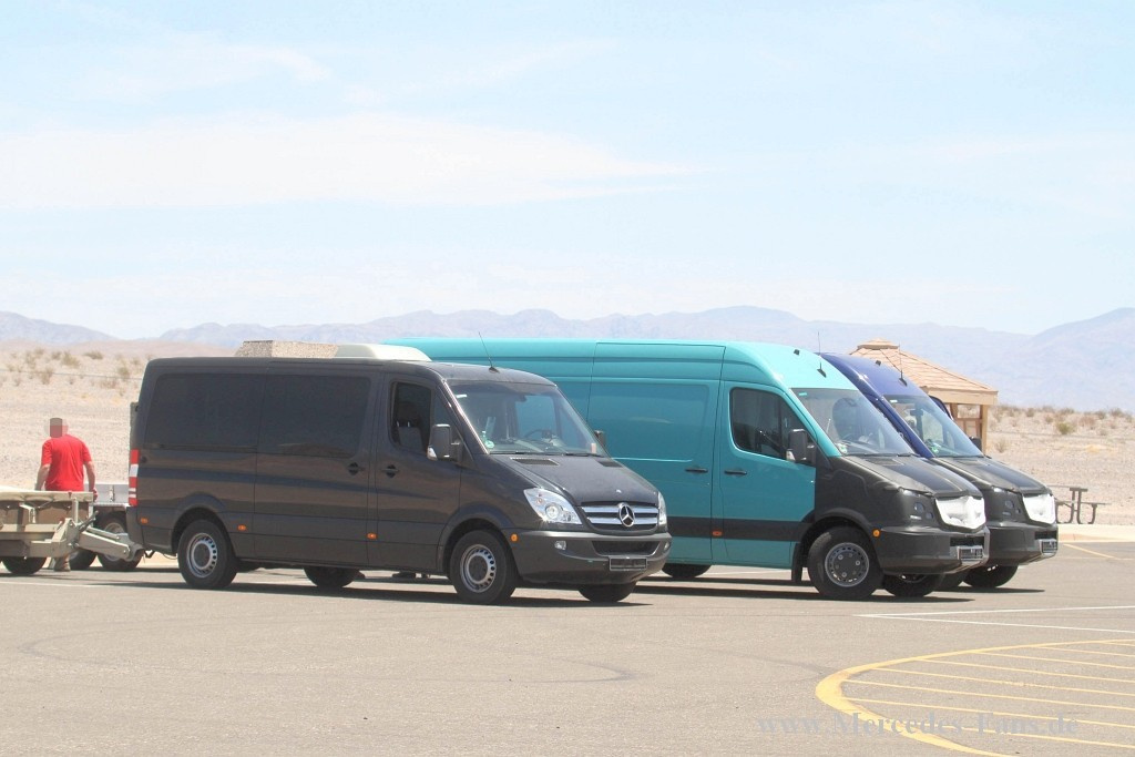 Gleich eine ganze Gruppe an neuen Sprinter Facelift sind unseren Erlkönig-Jägern bei Testfahrten im Death Valley vor die Kamera gefahren. Die Truppe von Mercedes ist dort zur Zeit beim "Hot-Weather-testing" angekommen. Erstmals sehen wir eine stark getarnte Front an mehreren unterschiedlichen Sprinter Versionen, egal ob Kastenwagen oder Kipper. Auf manchen Bildern erkennt man schon