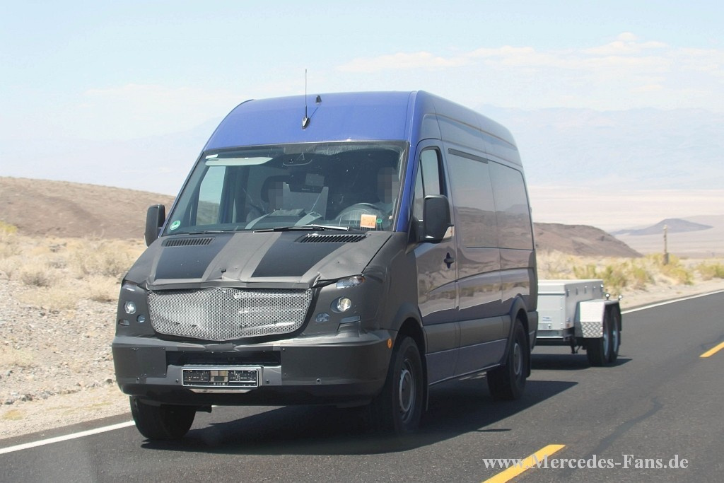 Gleich eine ganze Gruppe an neuen Sprinter Facelift sind unseren Erlkönig-Jägern bei Testfahrten im Death Valley vor die Kamera gefahren. Die Truppe von Mercedes ist dort zur Zeit beim "Hot-Weather-testing" angekommen. Erstmals sehen wir eine stark getarnte Front an mehreren unterschiedlichen Sprinter Versionen, egal ob Kastenwagen oder Kipper. Auf manchen Bildern erkennt man schon den neuen Grill unter der Tarnung. Die Scheinwerfer erhalten LED Tagfahrlicht.