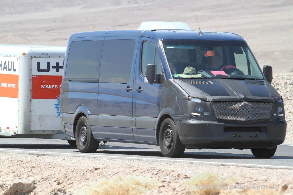 Gleich eine ganze Gruppe an neuen Sprinter Facelift sind unseren Erlkönig-Jägern bei Testfahrten im Death Valley vor die Kamera gefahren. Die Truppe von Mercedes ist dort zur Zeit beim "Hot-Weather-testing" angekommen. Erstmals sehen wir eine stark getarnte Front an mehreren unterschiedlichen Sprinter Versionen, egal ob Kastenwagen oder Kipper. Auf manchen Bildern erkennt man schon den neuen Grill unter der Tarnung. Die Scheinwerfer erhalten LED Tagfahrlicht.