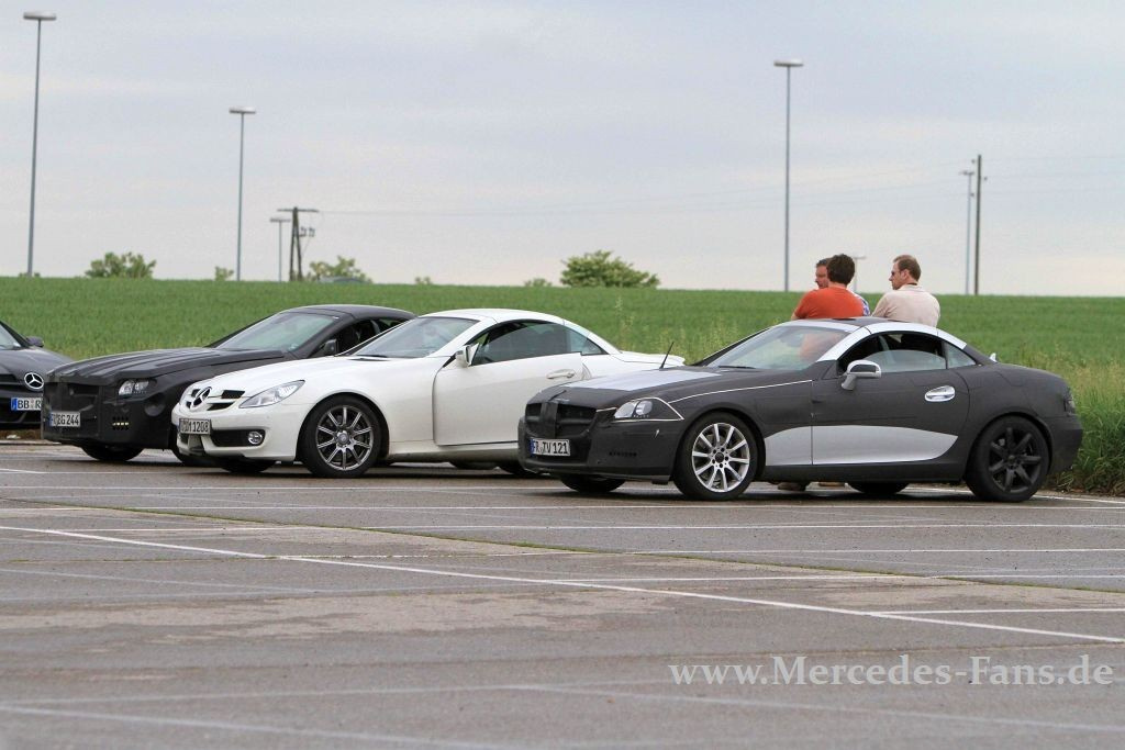 Gleich zwei Erlkönige des Mercedes SLK 2011 posieren neben dem aktuellen Zweisitzer