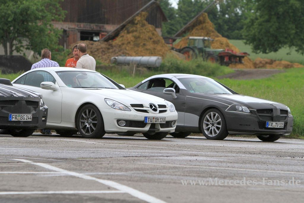 Gleich zwei Erlkönige des Mercedes SLK 2011 posieren neben dem aktuellen Zweisitzer