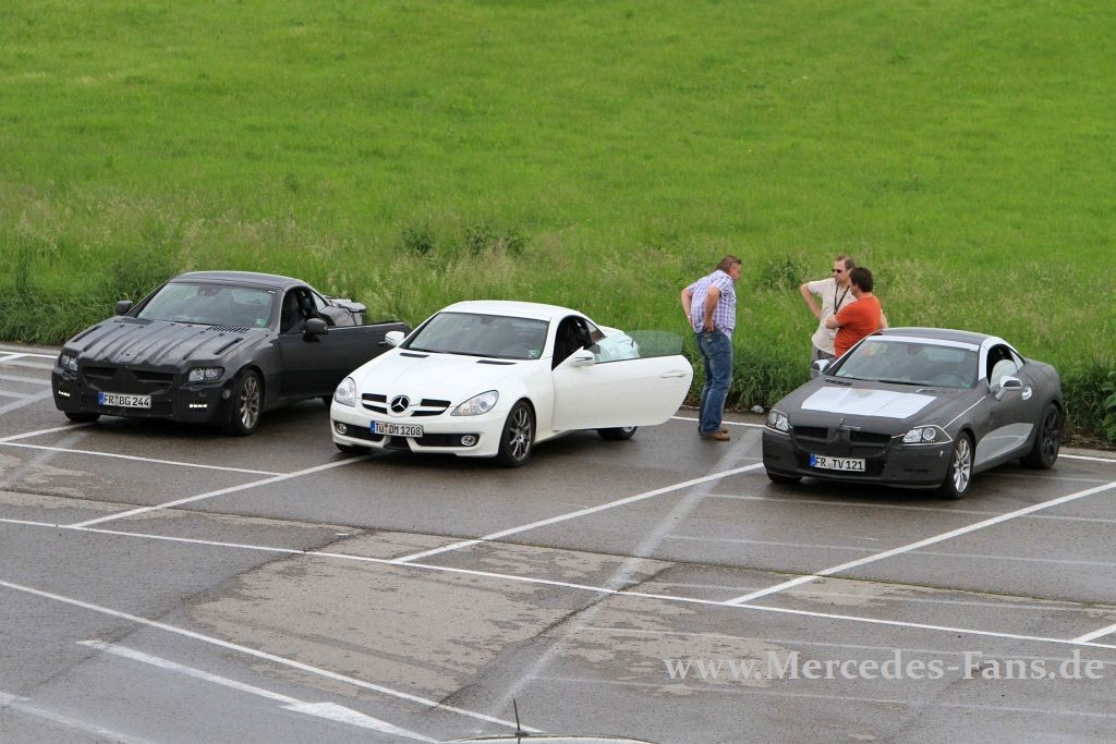 Ein Bild wie aus dem Familienalbum. An abgelegener Stelle formierten sich der aktuelle Mercedes SLK sowie zwei Generationen SLK-Erlkönige. Die Mercedes Tester wähnten sich sicherlich unbeobachtet, aber unser Mercedes Erlkönig-Jäger war schon da! KLICK- erwischt!