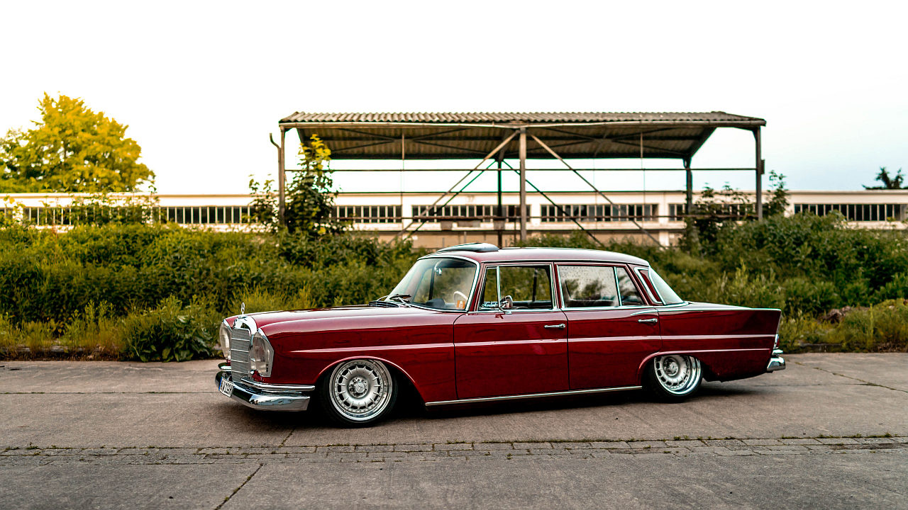 Mittelroter Mercedes-Benz W111 mit dreiteiligen 17" Barockfelgen und Luftfahrwerk