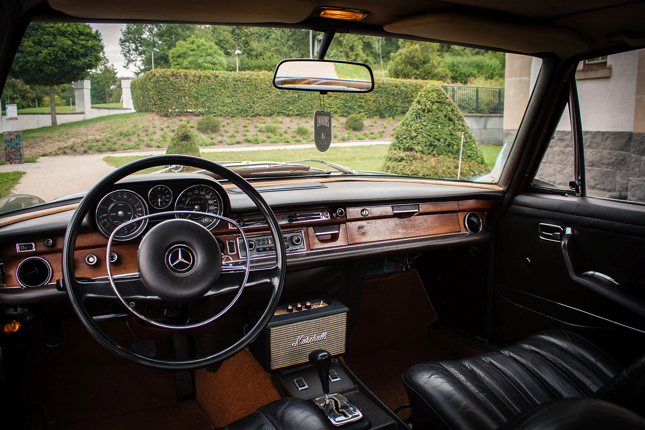 Mercedes-Benz 280SE W108 Innenraum mit Lederausstattung und Marshall Bluetooth Lautsprecher