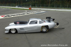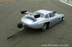 Der in der Schweiz gebaute und vom Schweizer Stefan Winter gefahrene Dragster, den Mercedes-Fans.de hier in einem Bericht bereits ausführlich vorgestellt hat, erinnert an den berühmten Mercedes 300 SL mit Flügeltüren. Unter der Fiberglas-Karosserie steckt ein 6,9-Liter-Motor, der 1050 PS leistet und den Flügeltürer in 8,10 Sekunden über die 402 m lange Viertel-Meile genannte Dragsterstrecke jagt und am Ende eine Höchstgeschwindigkeit von 267 km/h erreicht.