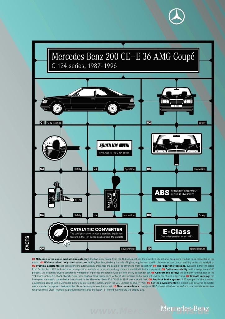 Der Zweitürer der Baureihe 124 ist ein Klassiker der Modellgeschichte von Mercedes-Benz. 1987 präsentiert der Hersteller genau zehn Jahre, nachdem auf dem Automobilsalon in Genf die Präsentation der Vorgängermodelle der Baureihe 123 erfolgt ist, dort die Coupés der Baureihe 124, die bis 1996 gebaut werden. Trotz der engen technischen und stilistische Verwandtschaft zur Limousine, treten die Coupés eigenständig auf. Sie überzeugen bis heute insbesondere mit ihrem ausgewogenen und zurückhaltenden Design und sind somit perfekte moderne Klassiker.
