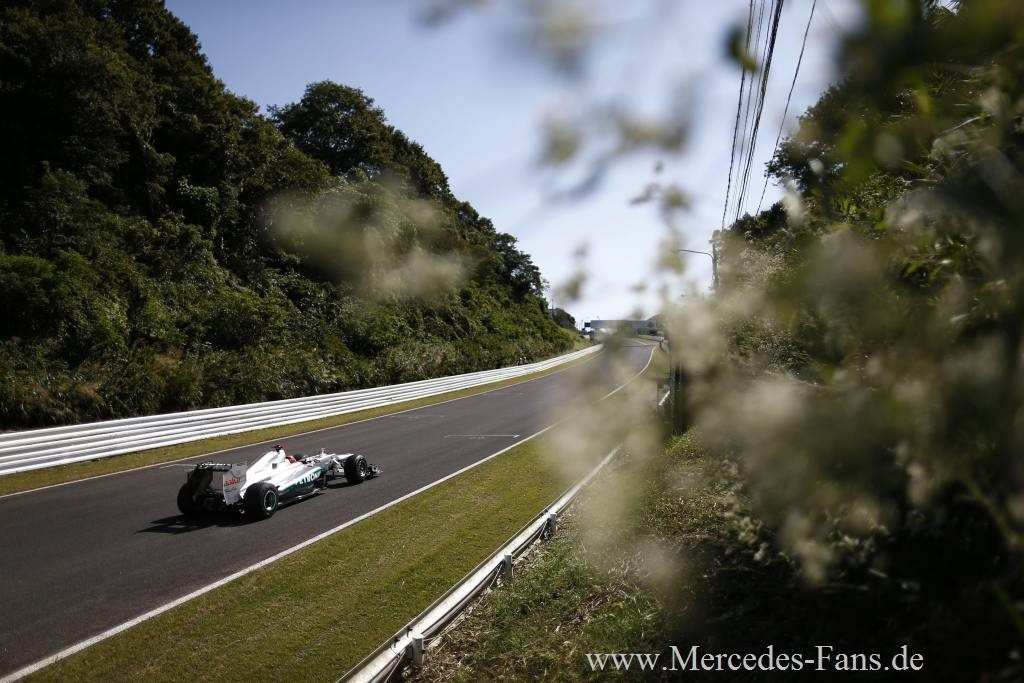 Beim Großen Preis von Japan 2012 auf dem Rennkurs in Suzuka, das Sebastian Vettel gewann, haben die Mercedes-Silberpfeile knapp die Punkte verpasst. Während Rosberg schon früh nach einer Kollision ausgeschieden war, fuhr Michael Schumacher ein engagiertes Rennen. Er startete nach einer Rückversetzung vom 23. Startplatz und konnte bereits in der Anfangsphase des Rennens viele Positionen gutmachen. Bis ins Ziel konnte sich der Rekordweltmeister im Vergleich zu seiner Startposition um zwölf Plätze verbessern. "Das Rennen hier in Japan hinterlässt bei mir etwas gemischte Gefühle - denn es ist natürlich schade, wenn man so knapp die Punkteränge verfehlt, auch wenn das Rennen insgesamt vielleicht sogar besser lief als erwartet", erklärte der Mercedes-Weerksfahrer Deutsche nach der Zieldurchfahrt.