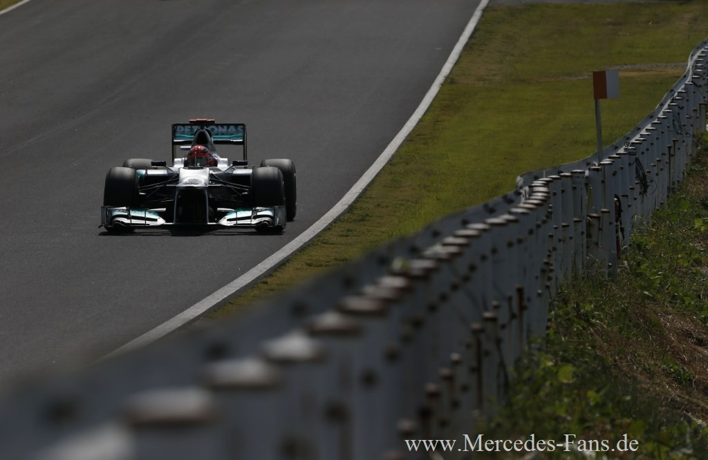 Beim Großen Preis von Japan 2012 auf dem Rennkurs in Suzuka, das Sebastian Vettel gewann, haben die Mercedes-Silberpfeile knapp die Punkte verpasst. Während Rosberg schon früh nach einer Kollision ausgeschieden war, fuhr Michael Schumacher ein engagiertes Rennen. Er startete nach einer Rückversetzung vom 23. Startplatz und konnte bereits in der Anfangsphase des Rennens viele Positionen gutmachen. Bis ins Ziel konnte sich der Rekordweltmeister im Vergleich zu seiner Startposition um zwölf Plätze verbessern. "Das Rennen hier in Japan hinterlässt bei mir etwas gemischte Gefühle - denn es ist natürlich schade, wenn man so knapp die Punkteränge verfehlt, auch wenn das Rennen insgesamt vielleicht sogar besser lief als erwartet", erklärte der Mercedes-Weerksfahrer Deutsche nach der Zieldurchfahrt.