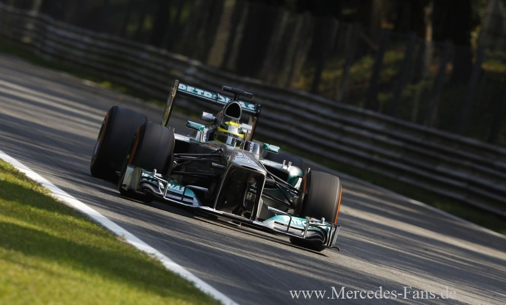 Die Mercedes-Werksfahrer Nico Rosberg und Lewis Hamilton beendeten den Großen Preis von Italien in Monza auf den Positionen sechs und neun. Hamilton hatte auf seinem ersten Satz Prime-Reifen einen schleichenden Plattfuß vorne rechts und musste in Folge dessen in Runde 13 vorzeitig an die Box kommen. Nicos Boxenstopp war mit einer Gesamtdurchfahrtszeit von 24.079 Sekunden der schnellste des Rennens. "Wir hatten heute ein sehr schnelles Auto und somit war...,